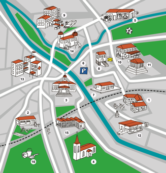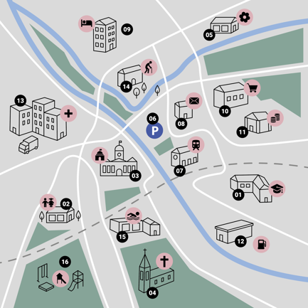 Davo quist'introducziun prouvan ils students e las studentas d’attribuir ils noms dals edifizis ed implants al dret lö illa charta dal cumün. Els scrivan ils nomers 1-16 als drets lös illa charta. Ils resultats vegnan controllats in classa.